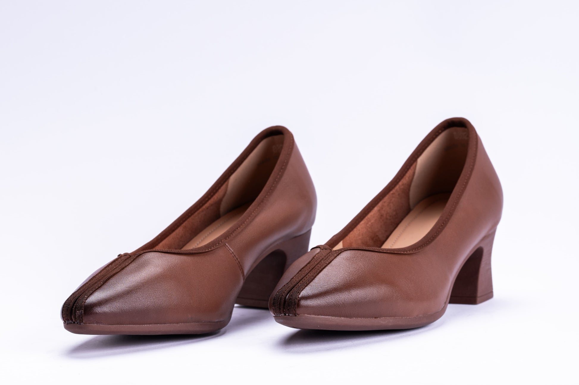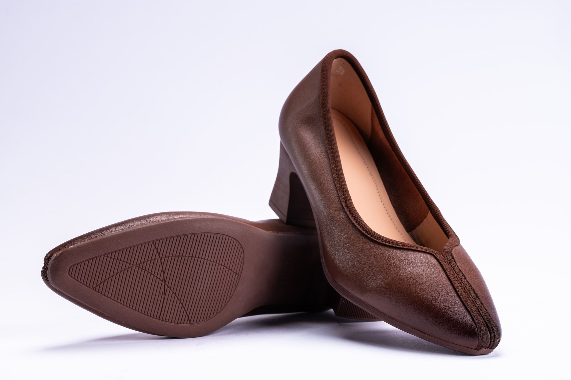 The closed-toe design is enhanced with a delicate seam detail and fine brown piping, adding a feminine touch while keeping the look clean and professional.