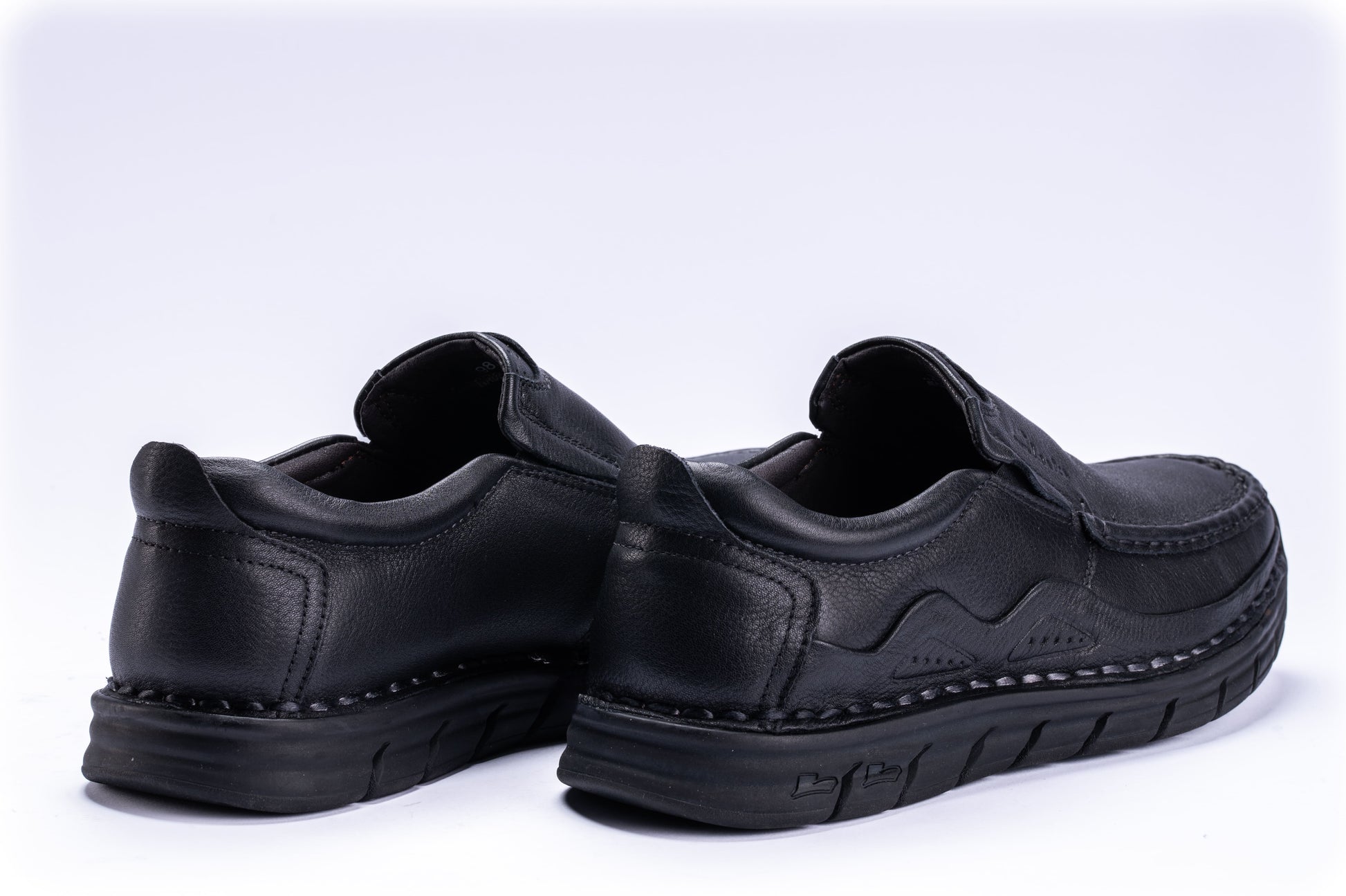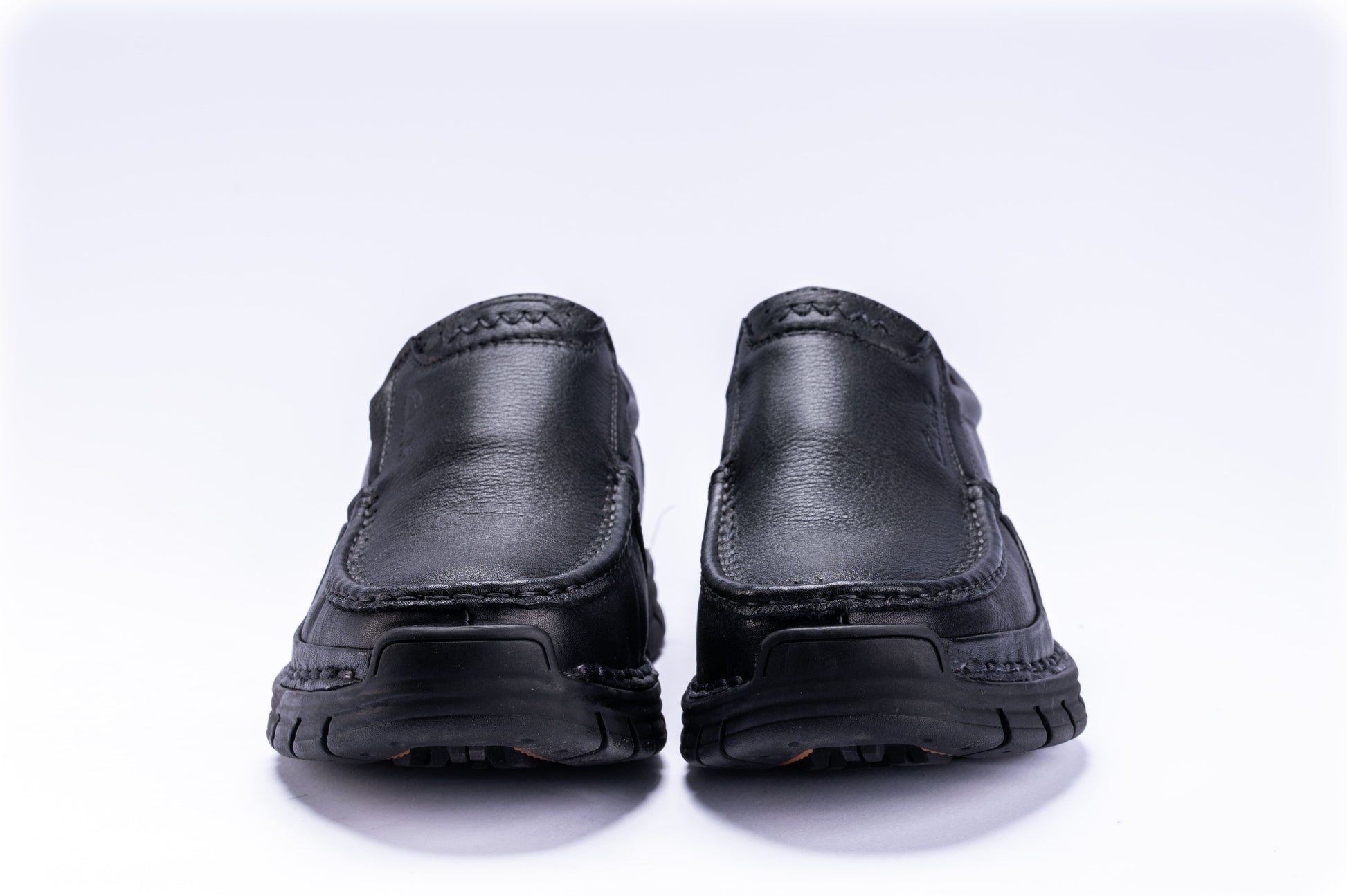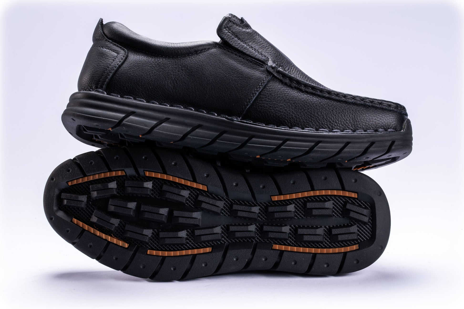 Harvey – Black is a classic men’s slip-on shoe crafted from black leather with a soft textured matte finish. The moccasin-style stitched toe box gives the shoe a clean, rounded profile, while the thick grooved black sole provides reliable traction and stable everyday comfort.