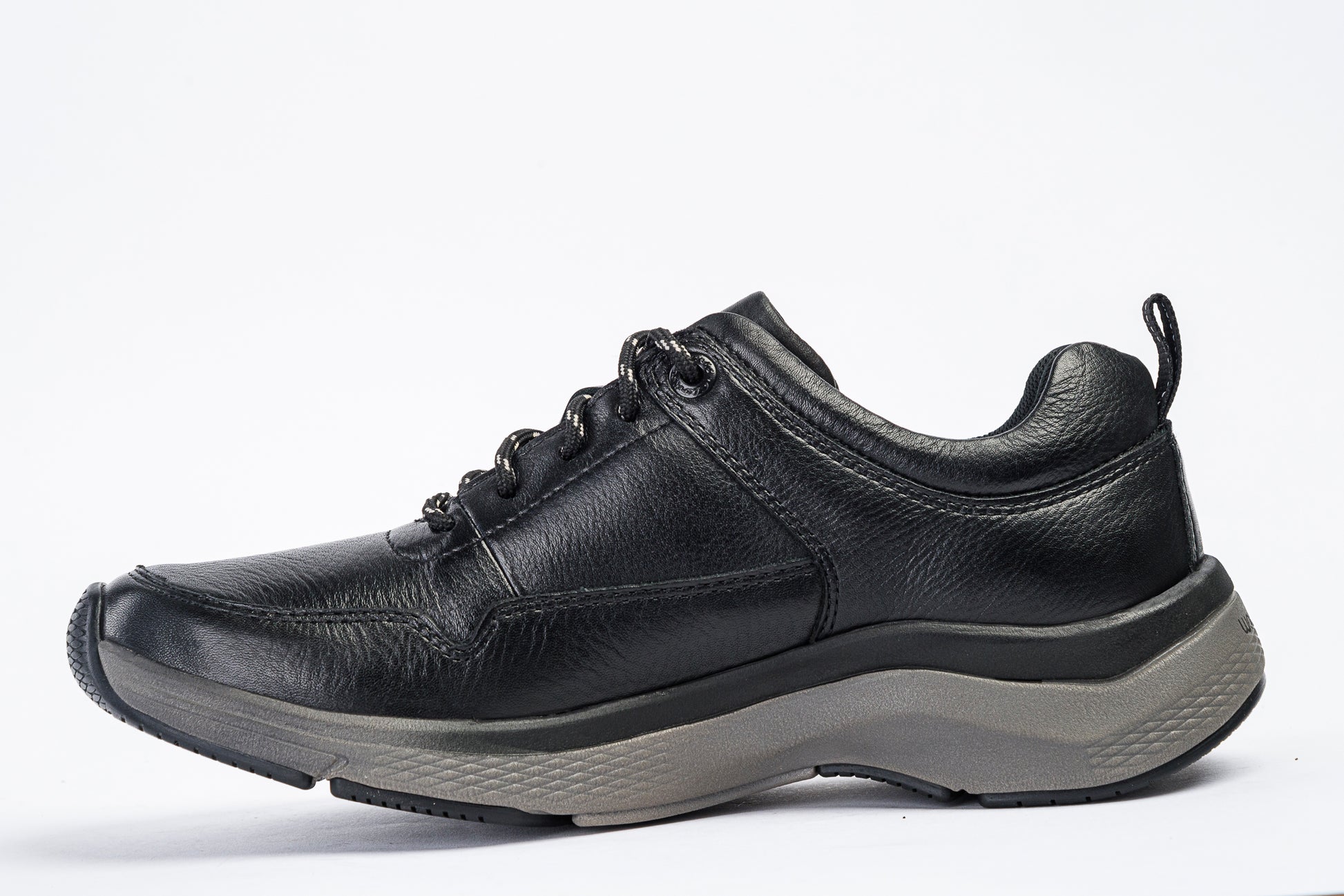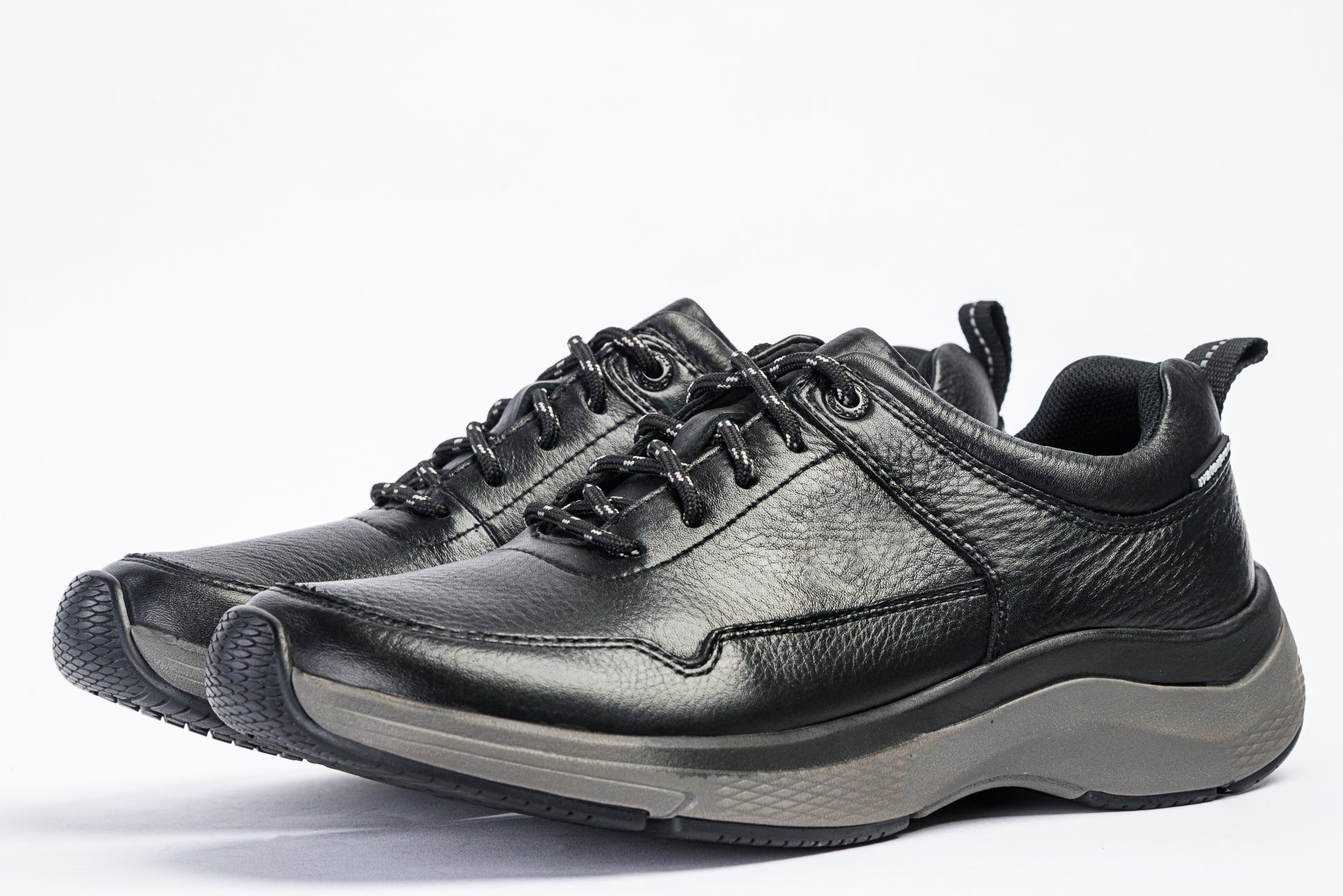 - Black textured leather upper with reinforced stitching