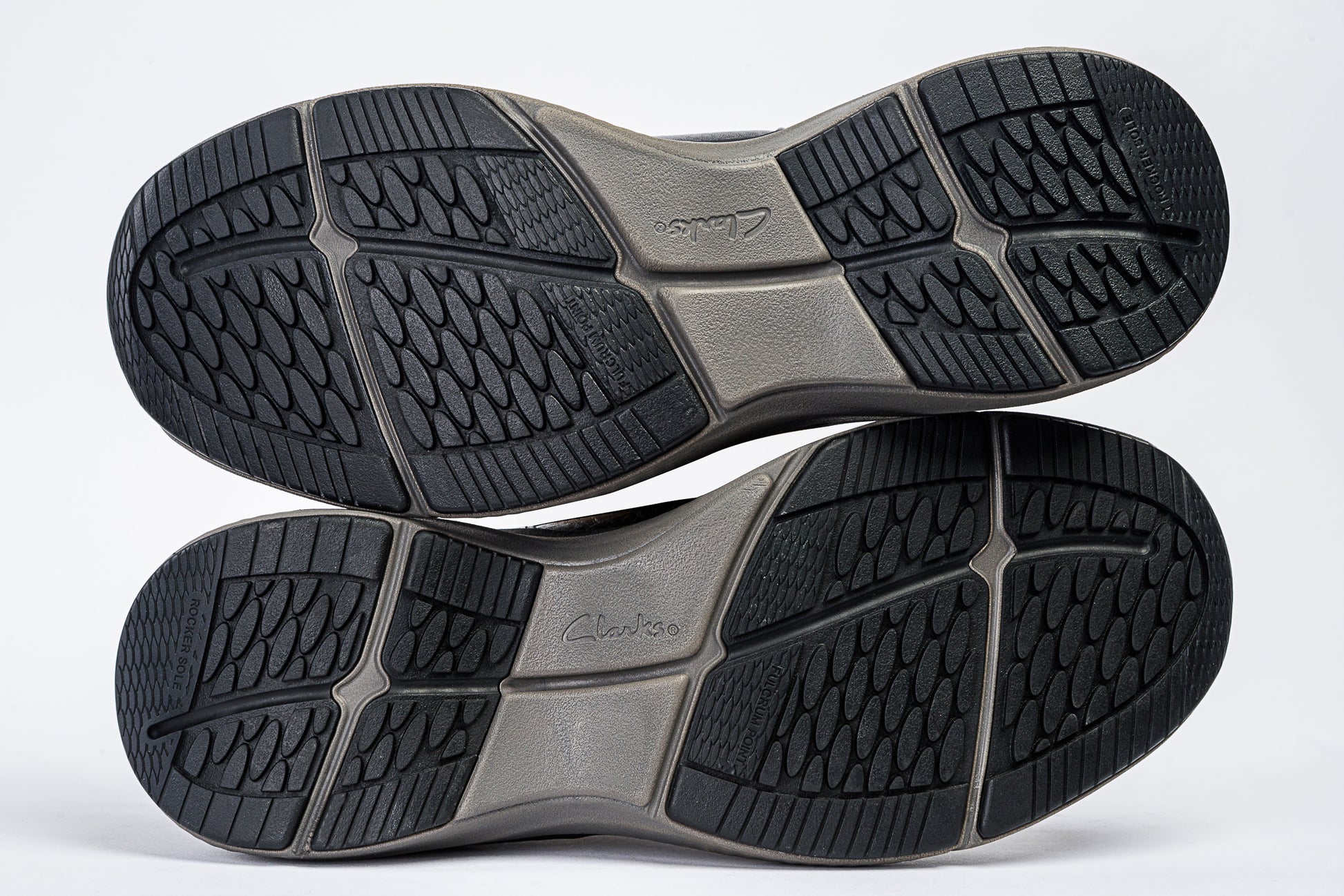The sole is a two-tone design — charcoal gray midsole over a black rubber base — featuring Clarks’ rocker motion system for smoother steps. With scale-textured grip zones and flexible tread lines, it’s made for steady movement and all-day comfort.